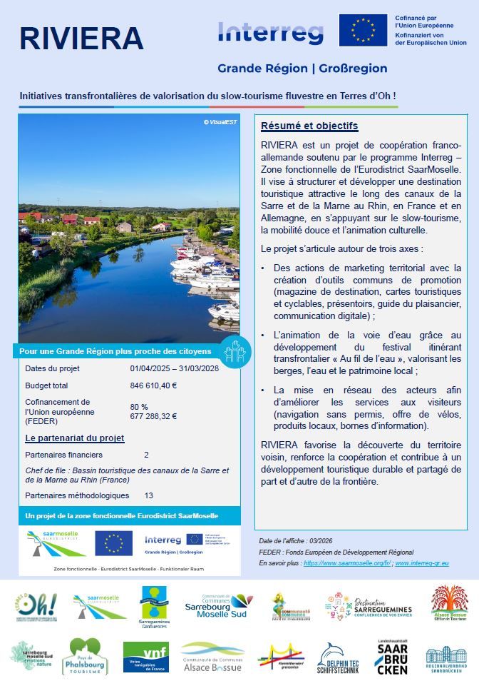 Ce projet est cofinancé par l’Union européenne dans le cadre du programme Interreg et de la zone fonctionnelle de l'Eurodistrict SaarMoselle. Retrouvez ci-dessous sa présentation détaillée (objectifs, partenaires et calendrier).